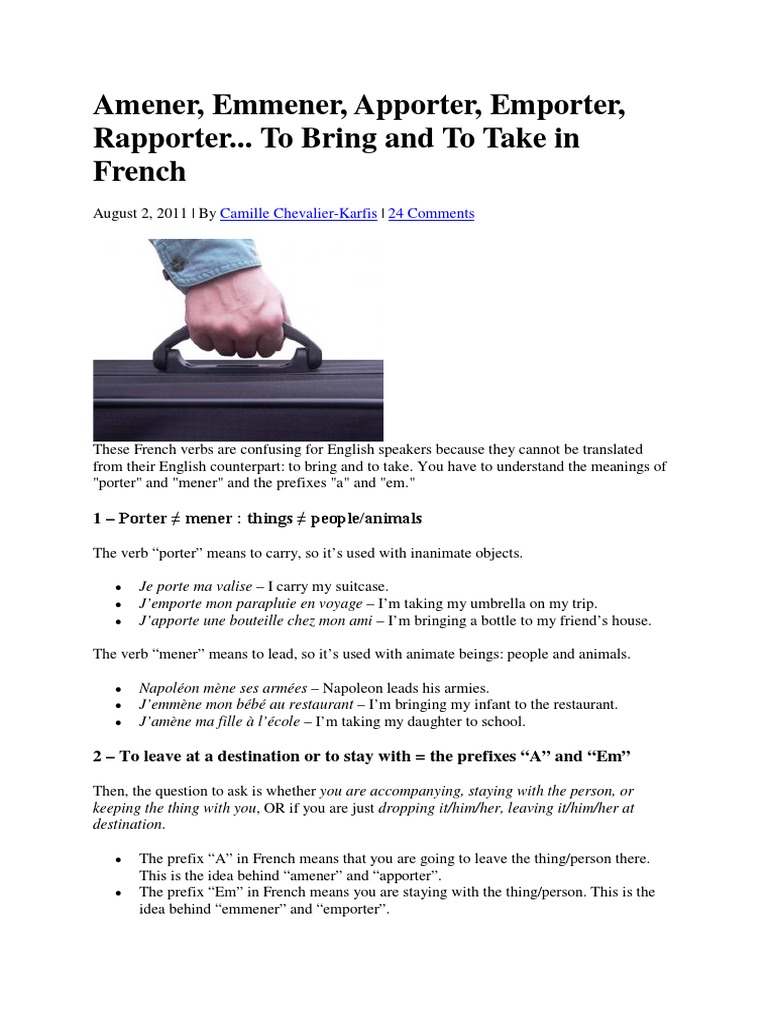 This causes all kinds of confusion, but it really is very simple once you understand the emmen. Emmener translated between french and english including synonyms, definitions, and related words.
